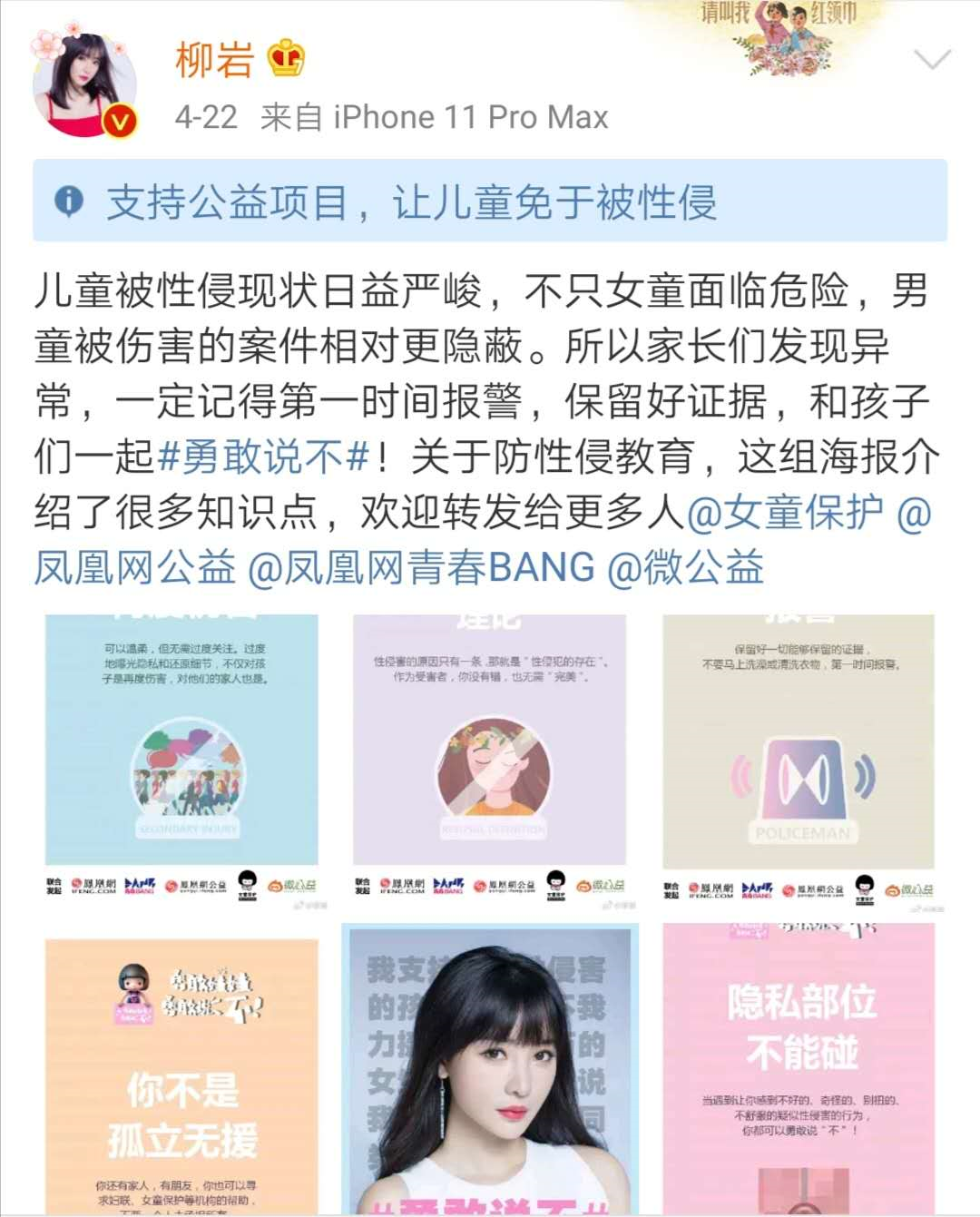 在4月14日,谢娜和女童保护基金联合发起话题#勇敢说不#后,4月22日,凤凰网公益、凤凰网青春BANG、女童保护基金和新浪微公益联合发起“勇敢娃娃,勇敢说不”公益倡导活动。