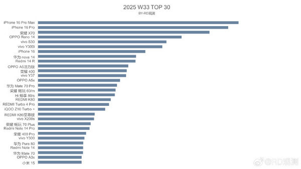 【CNMO科技消息】今日,有数码博主曝光了第33周国内手机销量TOP30榜单。榜单显示,iPhone 16 Pro系列稳居榜单前二,nova 14、Pura 80、Mate 70和70 Pro等四款华为手机同样入围榜单。