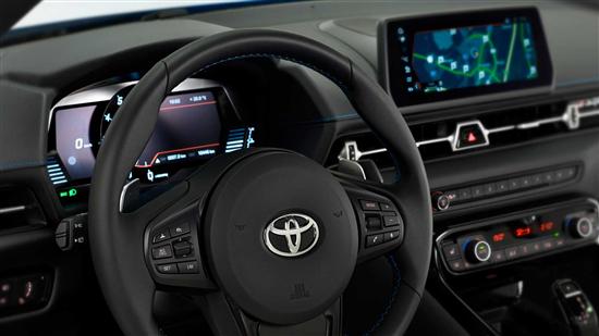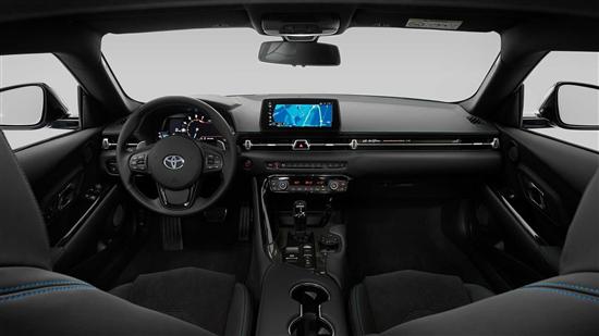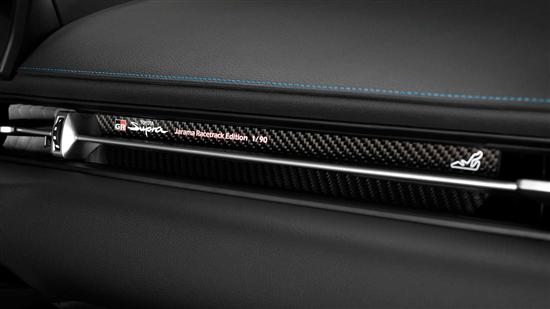 内饰部分,座椅坐垫和靠背的材质更换为Alcantara翻毛皮,缝线处理也融入了对比鲜明的蓝色缝线。同时,中控台碳纤维饰板处增加了特别版车型的铭牌以及生产编号。而配置方面,丰田GR Supra Jarama Racetrack Edition新增带有3D地图的GPS导航系统、Supra Connect互联功能、Supra Safety+驾驶员辅助系统以及包含主动刹车和车道偏离预警的主动安全套件。