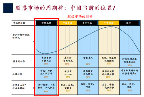 如果我们认为当前的问题主要是周期性问题,就需要回答市场尽管在3000点附近,市场到底处在一个什么样的位置?我们试图模糊精确去判定,当前市场到底处在一个什么样的位置,就这个具体位置而言,有底部、有复苏、有牛市中场、牛市顶部、熊市,如果我们从不同维度看这个问题,可以从基本面特征来理解如何判定市场底部还是复苏、还是顶部,也可以看估值特征、可以看投资者心理和技术面的特征。