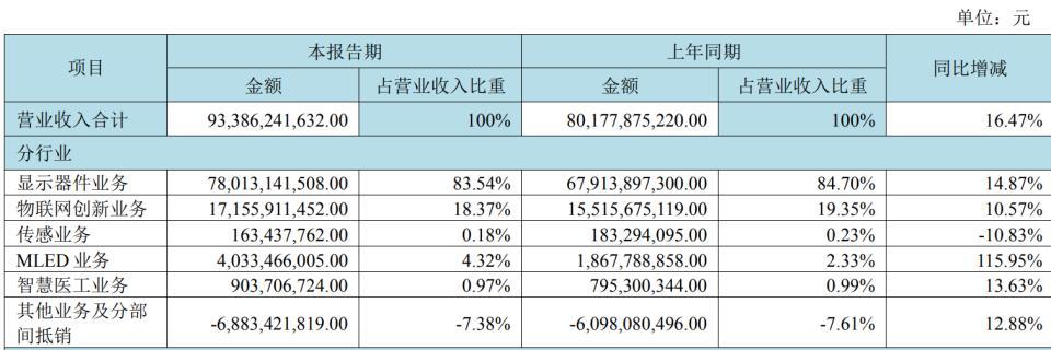 据京东方2024年上半年财报数据,MLED业务营收40.33亿元,占全部营收比例4.32%,同比增长115.95%。