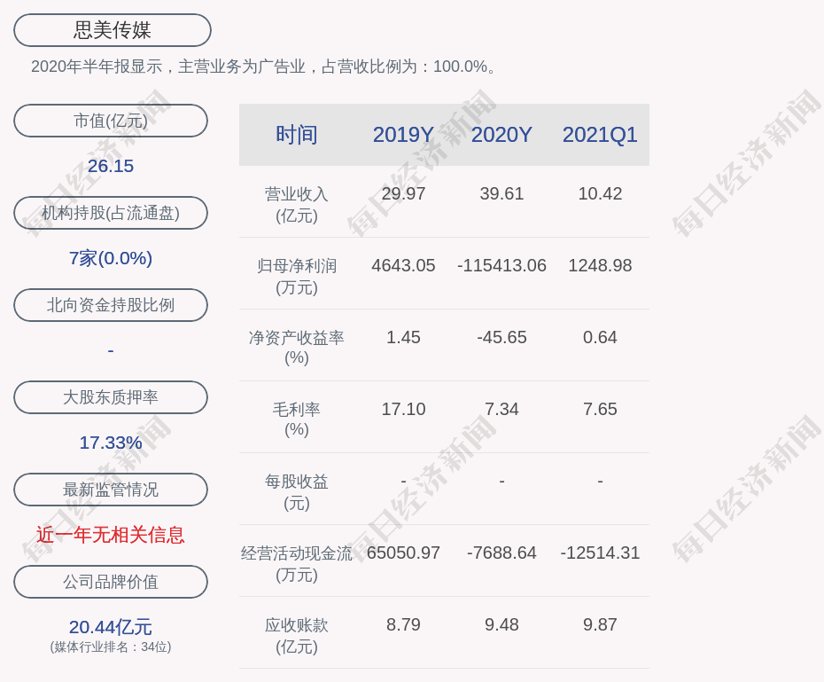 2020年半年报显示,思美传媒的主营业务为广告业,占营收比例为:100.0%。