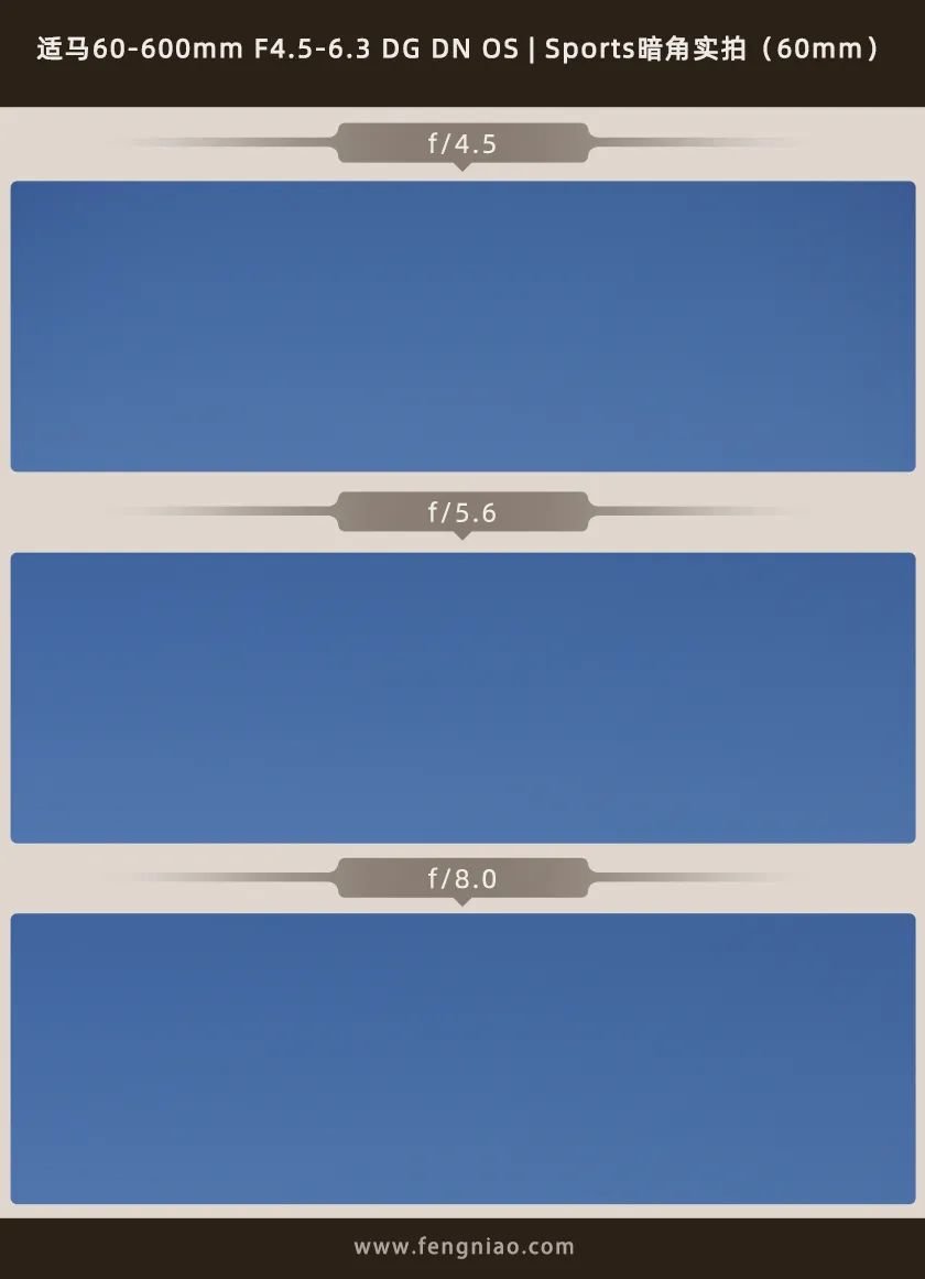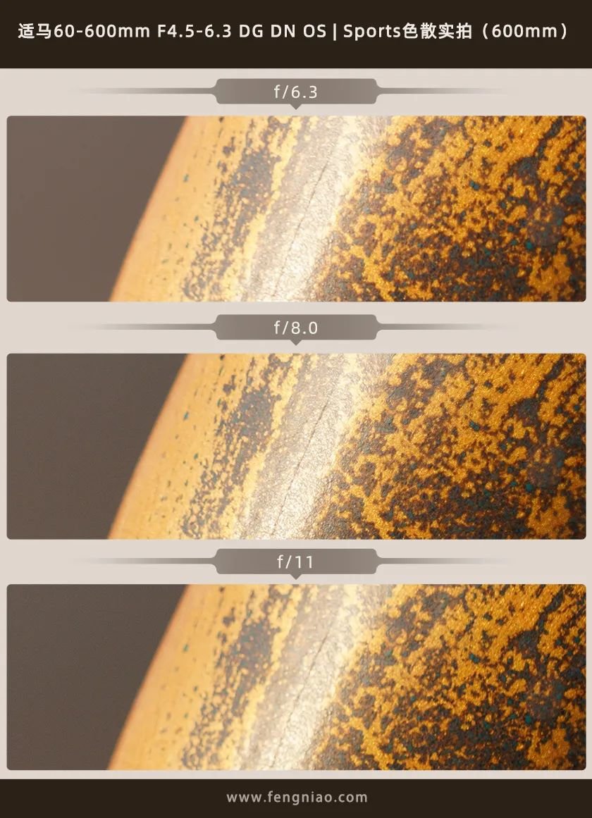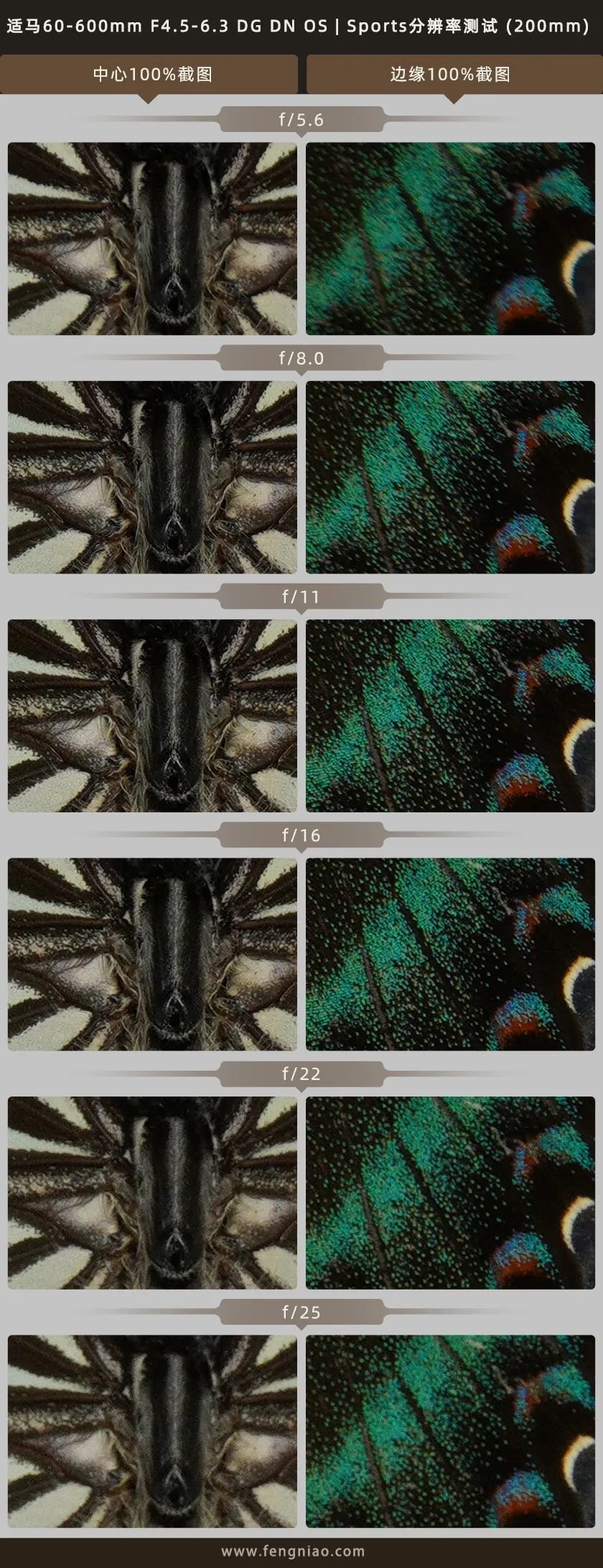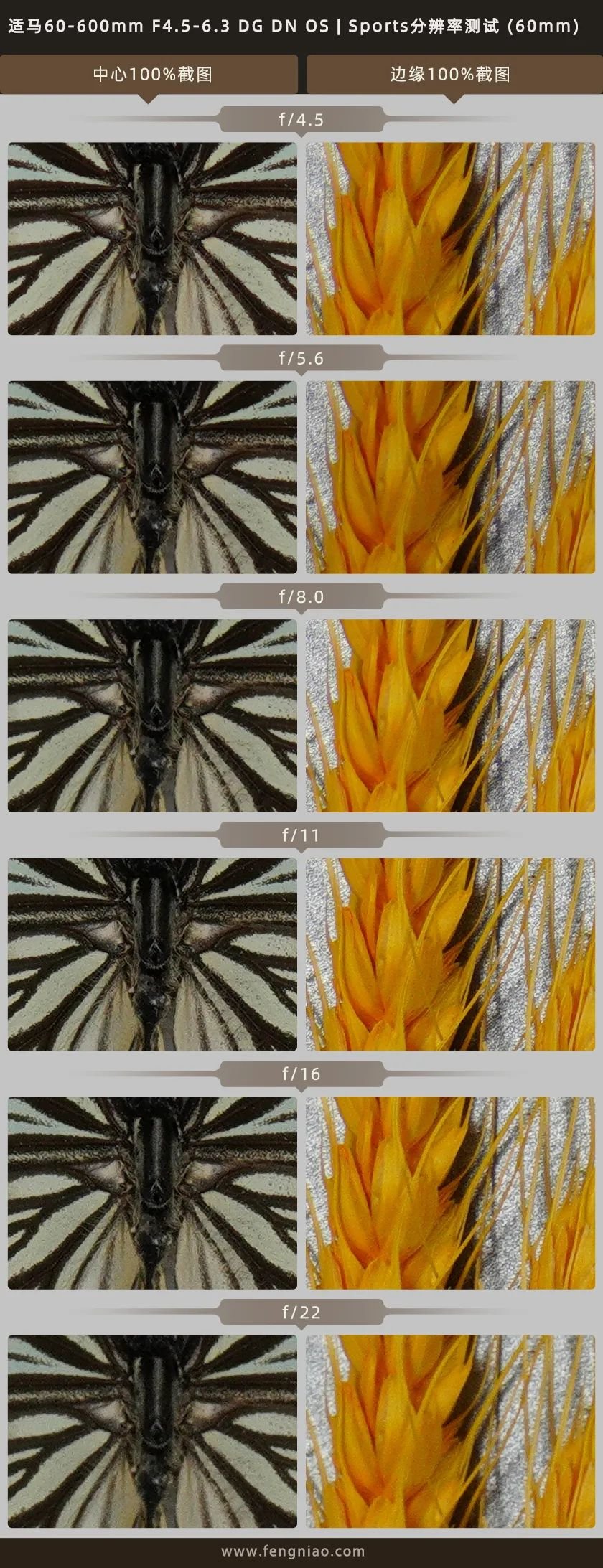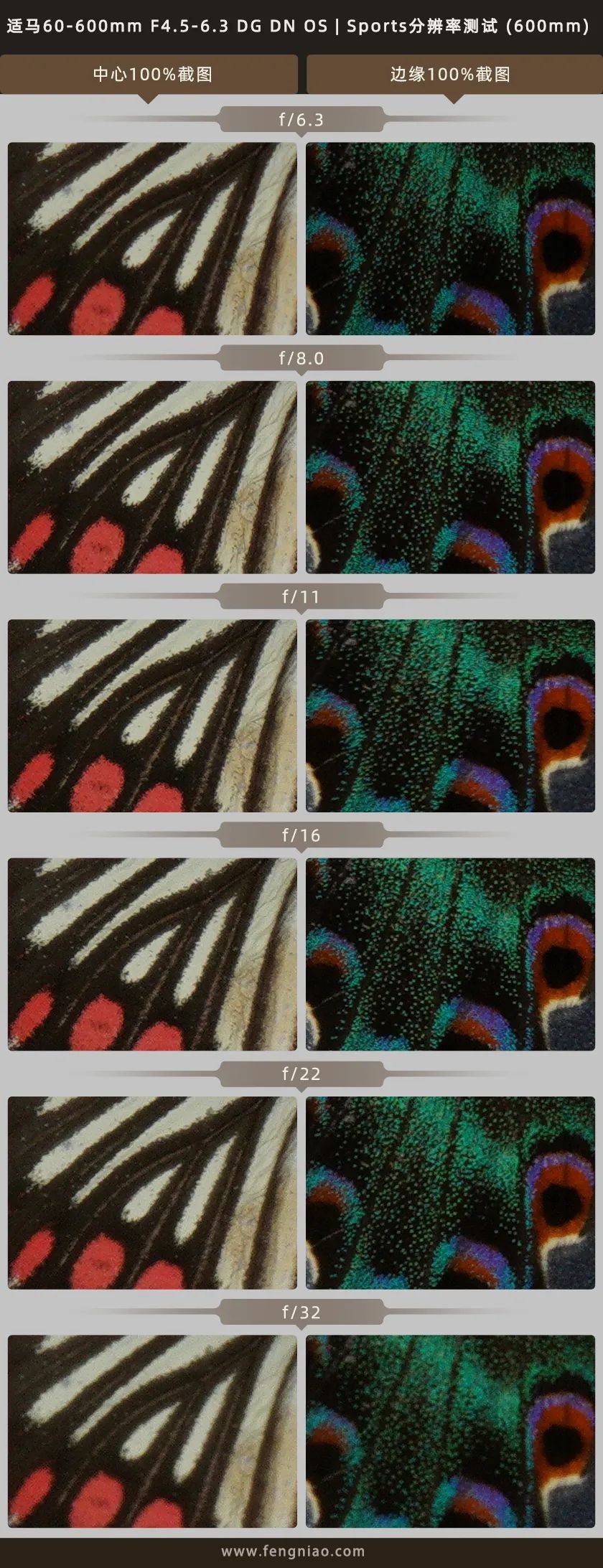 最后我们再来看看适马60-600mm F4.5-6.3 DG DN OS 丨Sports这支镜头在600mm的画质表现,测试方法和60mm以及200mm的方法一样,采用的三脚架固定、ISO 400、逐级调整光圈并保证正常曝光,实际100%截取中心和边缘画质对比。