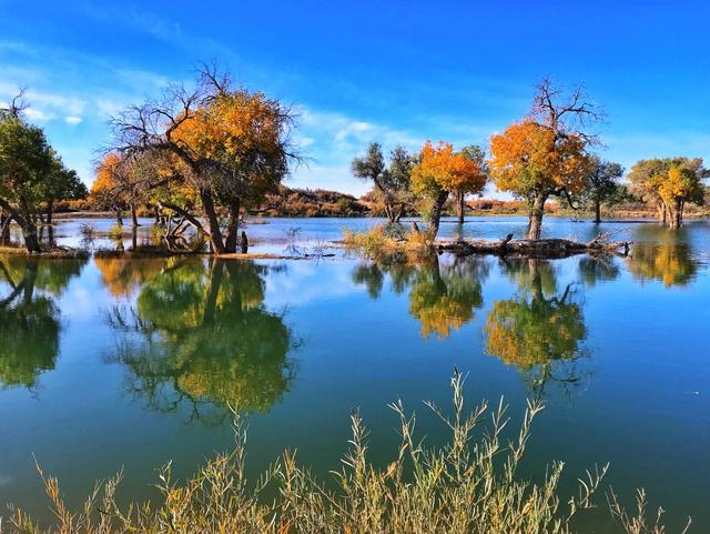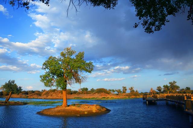 如意桥下,湖光的倒影与迎客的胡杨相映成趣,形成一道天然的大门。胡杨有各种奇怪的姿势,他们是不朽的战士。来自世界各地的游客在这里拥入他们的怀抱。让来自世界各地的游客聚在一起享受盛宴。