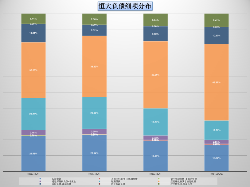 值得注意的是,恒大2021半年报1.97万亿的总负债,和2020年底1.95万亿的总负债相差不大。可以看出,恒大目前的策略,是做债务结构转换,降低更高成本的有息负债比例,抬升低成本的经营性负债比例。不过这其中也是风险重重,一旦上游在某一时间同时联合挤兑,恒大将顿陷困境。