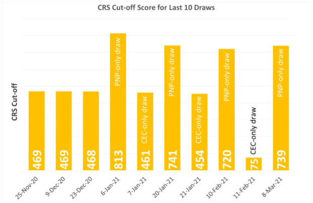 加拿大当地时间3月8日,联邦EE发布了新一轮邀请,本轮邀请仅针对指定类别(省提名类别),最低分739分,邀请人数671人。获得EE省提名邀请的候选人,在快速通道CRS的基础分数上会自动获得额外600分,因此相对于常规快速通道邀请,分数要求较高。
