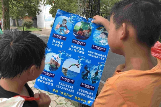 新余市罗坊镇希望小学,结束游泳考试后,两个学生正在看防溺水教育宣传牌。