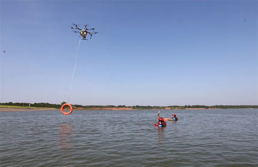 抚州市东乡区蓝豹救援队员正在操控无人机投放救生圈,在确保演练人员安全的条件下,模拟救援溺水人员场景,演示给当地的镇村干部、村民儿童观看,拧紧预防溺水“安全阀”。
