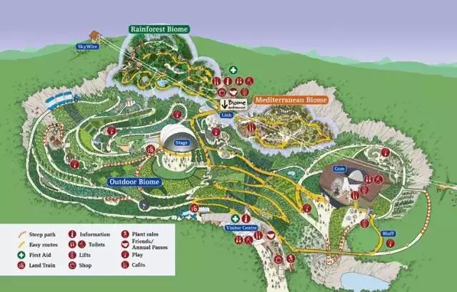 与其他一般的温室有所不同,英国伊甸园是世界上最大的单体温室,它汇集了几乎全球所有的植物,超过4500种、13.5万棵花草树木在此安居乐业。在巨型空间网架结构的温室万博馆里,形成了大自然的生物群落。