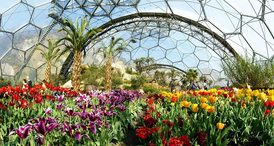 各馆内种植了来自全球的数万种植物,有来自从喜玛拉雅山到智利的奇花异草,也有来自康沃尔郡的本地植物。除了植物之外,还放养一些鸟类、爬行动物等,帮助消灭害虫,控制生态。