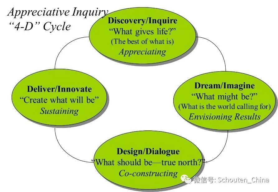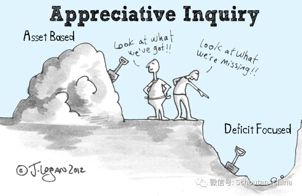欣赏式探询是一种基于优势的针对领导力发展和组织变革的积极方法,可被用于个人、团队、组织或是社会层面。在每个使用场景下,人们通过在战略性的创新中与他人深入合作,向着一个共享的未来目标一起前行。[9]
