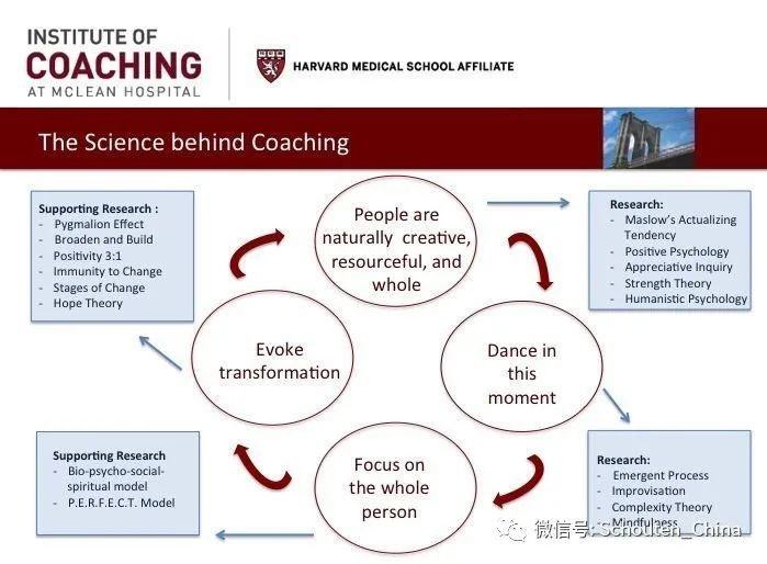 在共创式培训学院(Co-Active Training Institute,简称 CTI)官网上有一张图叫「The Science Behind Coaching(教练的科学)」,该图以共创式模型的四大基石为锚点,列举了模型背后的理论依据。