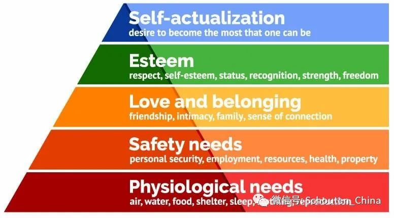 马斯洛理论把需求分成生理需求、安全需求、社会需求、尊重需求和自我实现需求五类,依次由较低层次到较高层次。五种需要像阶梯一样从低到高,按层次逐级递升。