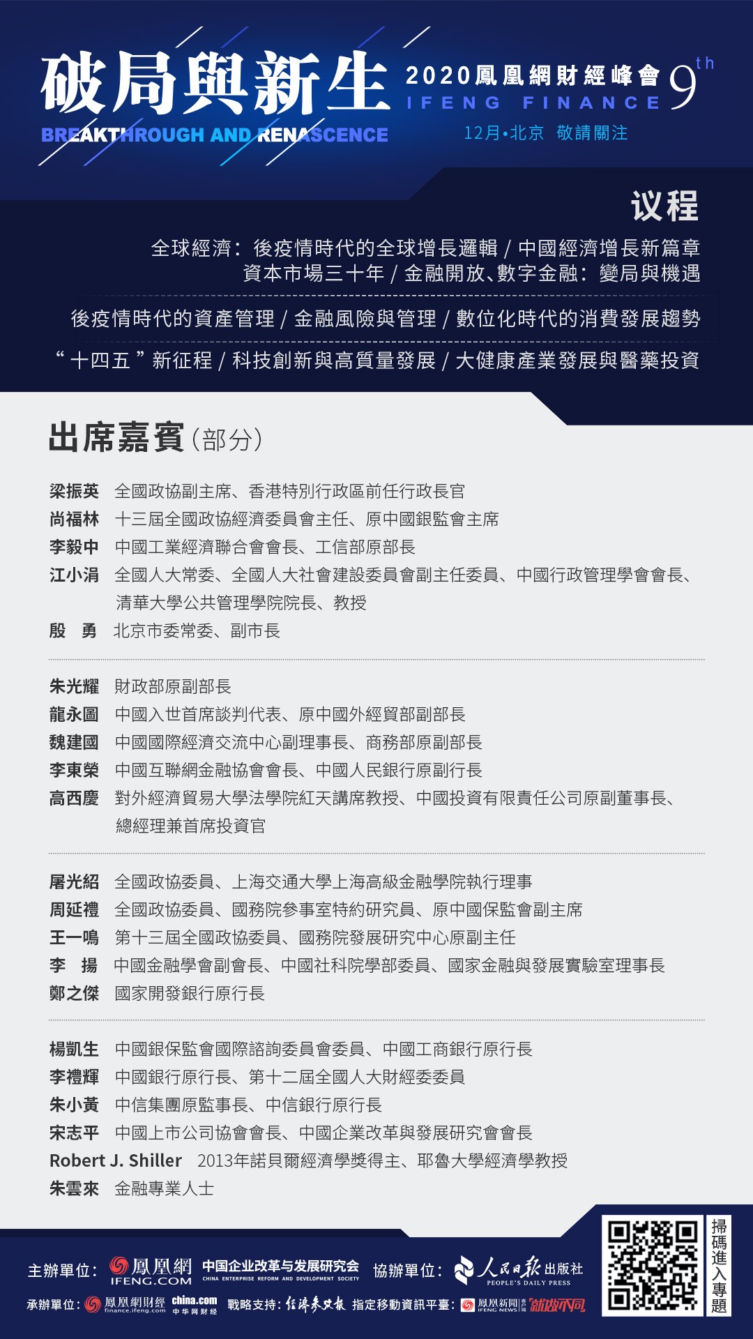 由凤凰网、中国企业改革与发展研究会主办,人民日报出版社协办,凤凰网财经、中华网财经承办的以“破局与新生”为主题的“2020凤凰网财经峰会”,盛邀政商学界顶级嘉宾,围绕新一轮全球化和中国经济“双循环”发展格局建言献策,为投资者投资中国和全球资产配置贡献一场高质量的思想盛宴。