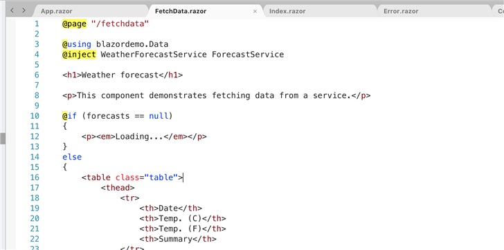 此版本添加对编辑 .razor 文件的支持,这些是在创建 Blazor 应用程序时将使用的文件。此版本的编辑器支持 .razor 文件的高亮着色、IntelliSense 和自动补全。Windows 版本和 Mac 版本的 IDE 使用相同的 .razor 文件编辑器。