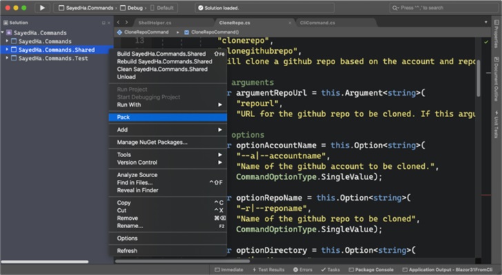 在此版本中,在 .NET 核心库项目创建 NuGet 包是更加容易的。右键单击项目,然后按照下面的示例选择 Pack 菜单选项(如下),之后就可在 Output 文件夹中找到 NuGet 包(.nupkg 文件):