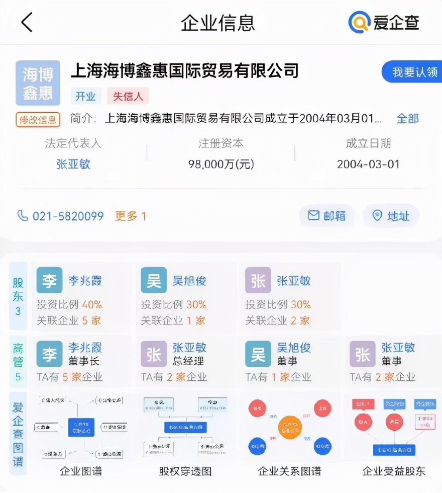 爱企查显示,李兆会曾短暂控股并担任过海博鑫惠公司法定代表人,退出后该公司的大股东和实际控制人名叫李兆霞,为李兆会的亲妹妹,兄妹二人均曾被法院限制出境。