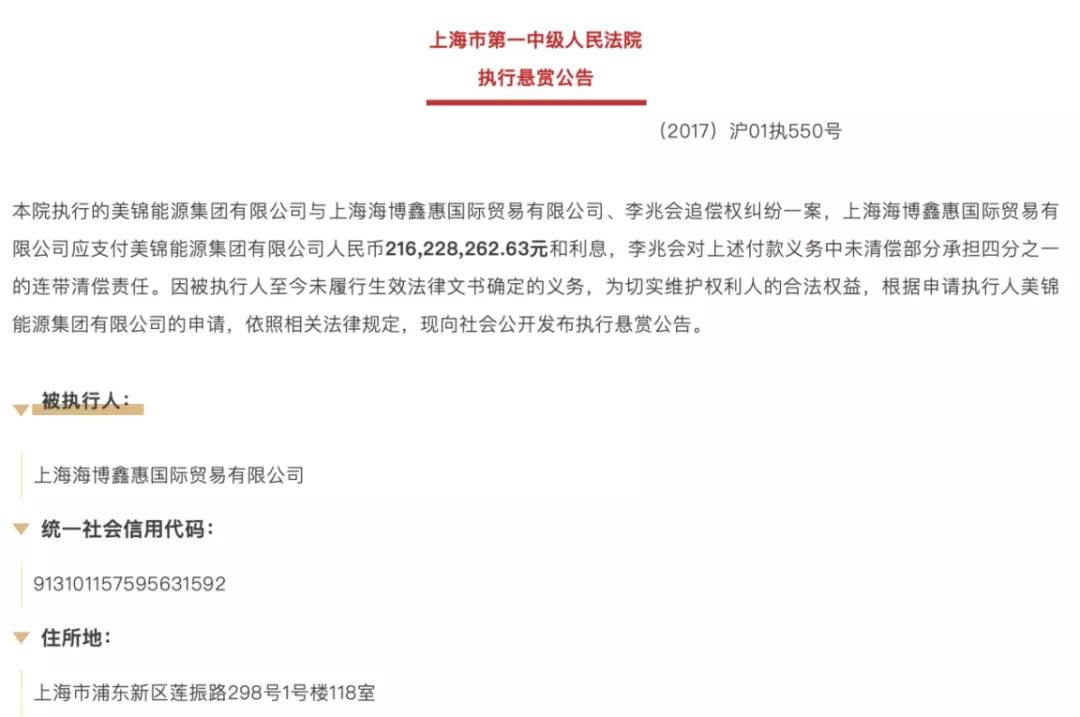 2017年3月15日,法院判决海博鑫惠向美锦公司支付代偿本息合计款2.16亿元,李兆会承担四分之一连带清偿责任。