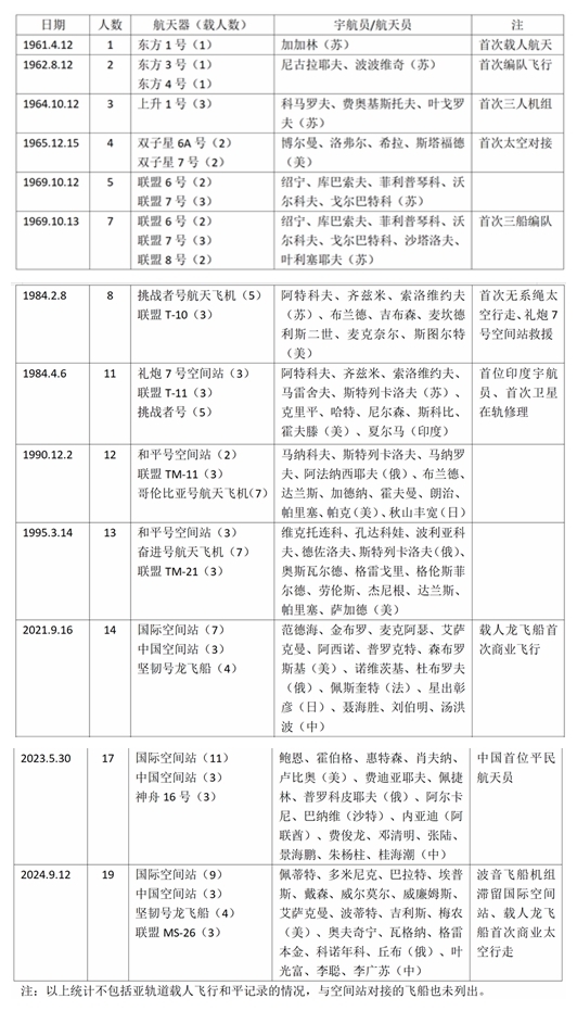 太空人口从零增长到19,人类花了63年多,详见下表: