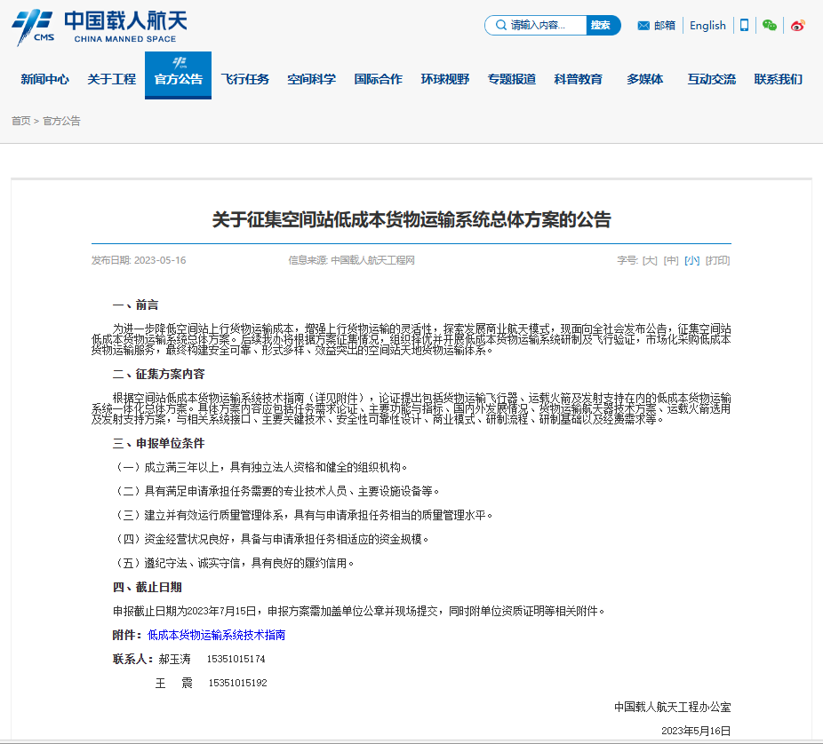空间站低成本货运系统方案征集公告官网截图(图源:CMS)