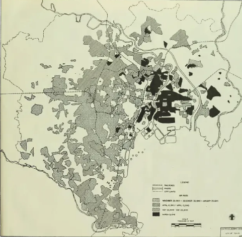 美军绘制的轰炸地图,黑色部分即为被烧毁的区域。