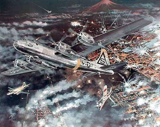 火攻东京行动中的B-29绘画,地面燃起了冲天大火,还遭到了日军战斗机的拦截,但拦截效果很差。