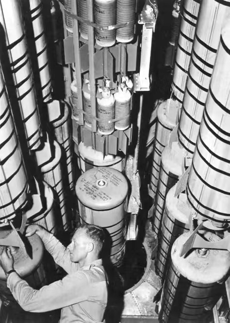 装载完毕的M69燃烧弹,每架飞机装载4.5~6.4吨。