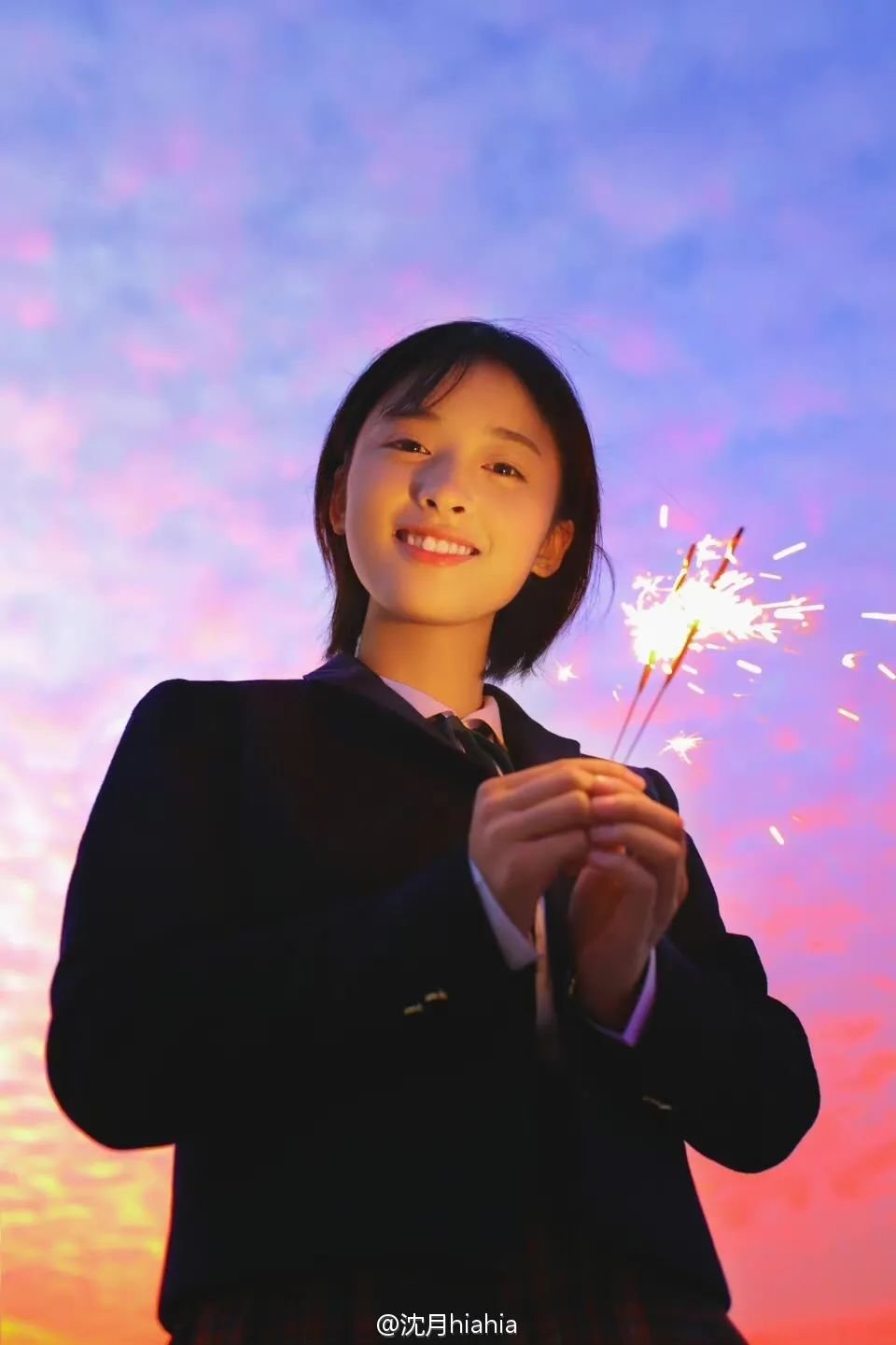 在天台拍摄烟花照,还可以学沈月尝试一下日系风格。身穿日系感的制服,拍摄时镜头微仰,以仰拍的角度来构图。不需要刻意摆什么造型,画面里只剩蓝紫色的晚霞以及璀璨的烟火,沈月本身的气质就很日系风,微微吹来的晚风浮动着发丝,散落的花火星光⭐️折射在眼睛里,自带着少女纯净,有一股清澈的意蕴🫧。
