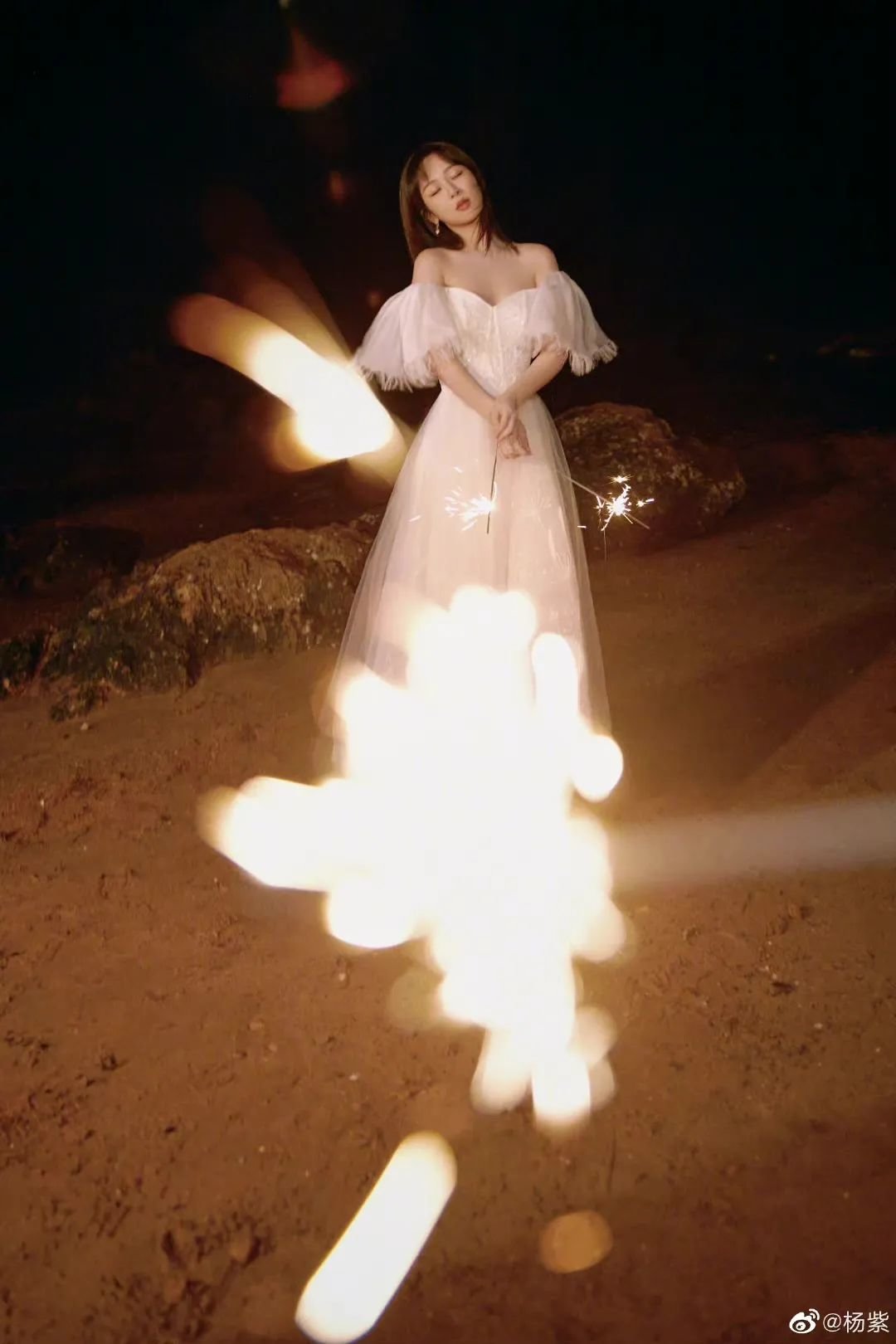 一袭白色纱裙,杨紫像是参加完宴会🍷出逃的公主。在拍摄时巧妙地将烟花作为【前景】,光亮与白纱融为一体,宛如屏幕前划过的流星雨☄️,耀眼的光芒比银河系🌌的星星还要多。