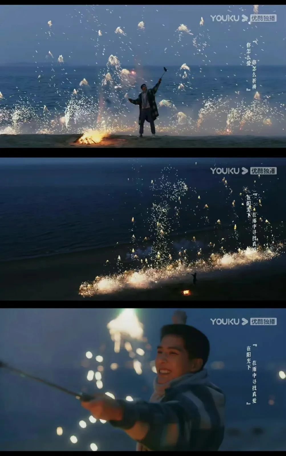 《炽道》里段宇成隔着屏幕为罗娜放烟花,蓝黑漫天际🏙,花火绽放于空旷的海滩上,也照亮着罗娜的整个世界🌏。此处艾特跨年的异地恋情侣们,快来抄作业。