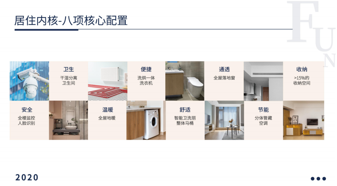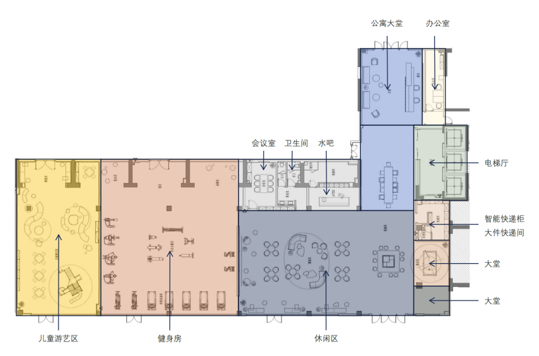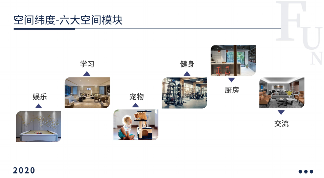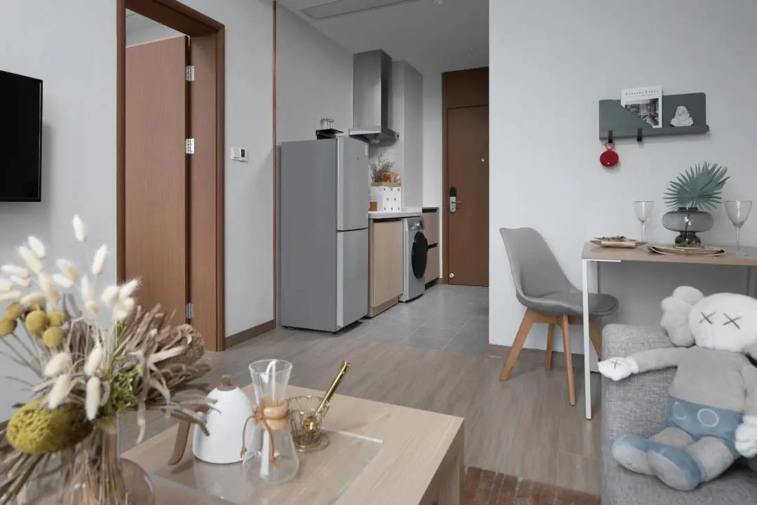 方隅将公区分为六大空间模块,分别为娱乐、学习、宠物、健身、厨房、交流,再从租户一天生活的六段时间,包括早中晚餐、工作休闲等,将租户每一段时间对公区的需求融入到公区模块内,打造大堂等候区、外卖存放区、休闲娱乐区、工作学习区等等,从租户的使用习惯出发,为住户提供实用、便捷又兼具社交功能的公共空间。并以此作为产品理念,从室内布局到家具电器,提供八大居住核心配置。