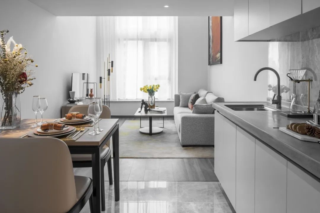 建筑方面,项目外立面整体简洁利落,采用大面积的落地玻璃,打造出通透感,首层的落地玻璃将室内与室外环境融合渗透,更扩大了首层公区的采光,增加居于自然的舒适度。