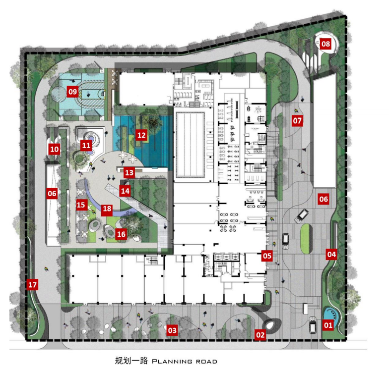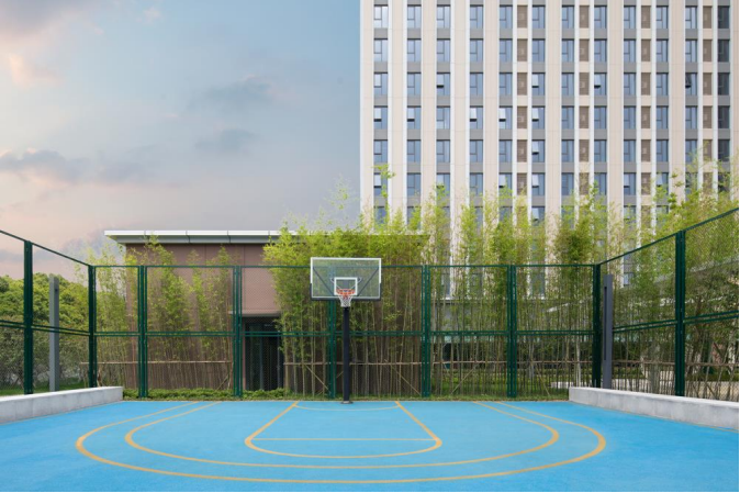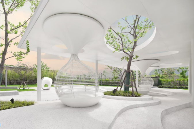 景观方面,项目拥有超大的室外公区,在室外打造了18个公园生活场景点,由林下交流空间、中心活动广场、互动构筑区和多功能篮球场构成了多层次多场景的室外活动空间。