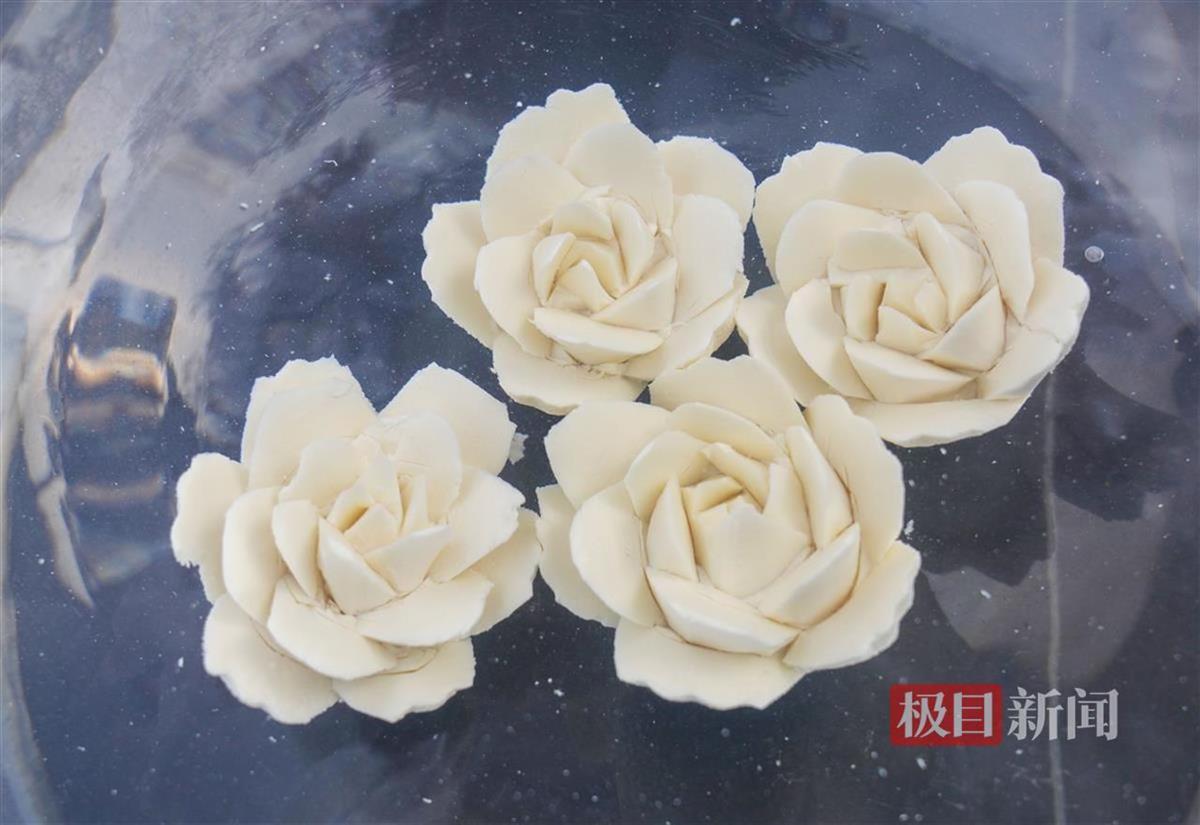 2分12秒,一朵栩栩如生的多瓣月季花,映入眼帘,让人惊叹不已。随后,如法炮制,又雕刻出4朵月季花。将它们放在装有清水的透明玻璃器皿中,显得生机勃勃。