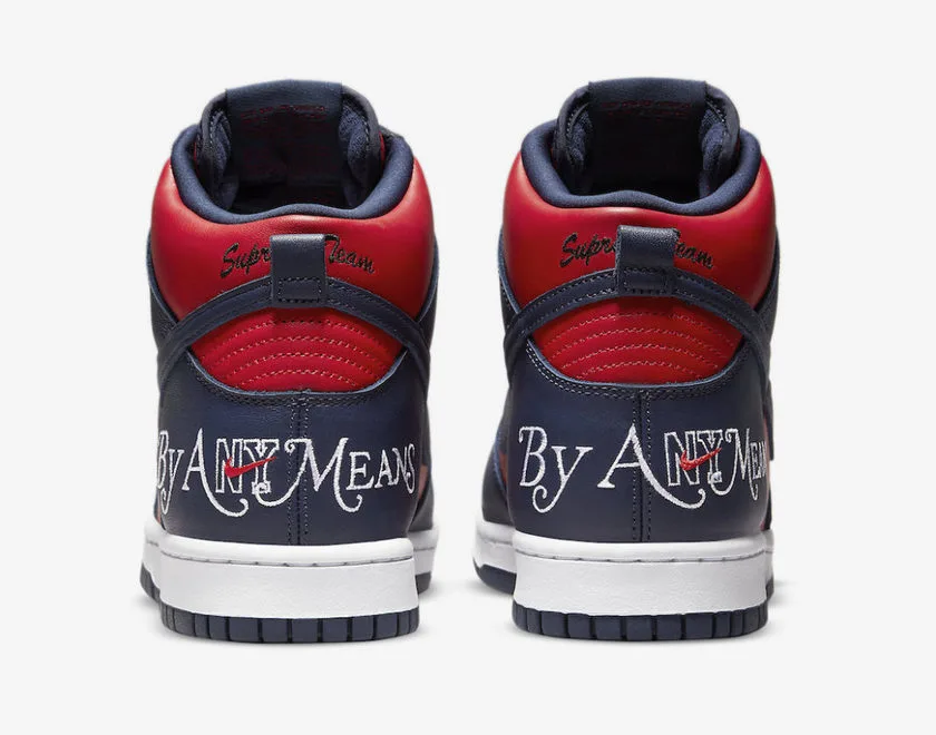 最近 Supreme 与 Nike 再度合作推出了一款以 SB Dunk High 为基础打造的全新联名鞋款。整个鞋面以红色和深蓝色拼接打造,鞋身遍布细节,包括鞋侧的 “NO” 字样和桃心图案、鞋舌标签的 SUP 特殊字样、后跟处的 “BY ANY MEANS” 字样以及 Supreme Team 刺绣,视觉效果十分出众。据悉这双全新的 Supreme x Nike SB Dunk High “By Any Means”会在今年年内正式发售,具体发售信息目前