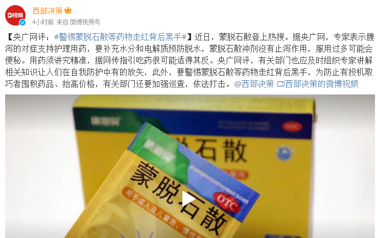 对于此次谣言事件,央广网评,有关部门应及时组织专家讲解相关知识让人们在自我防护中有的放矢,此外,要警惕蒙脱石散等药物走红背后黑手,为防止有投机取巧者囤积药品、抬高价格,有关部门还要加强巡查,依法打击。