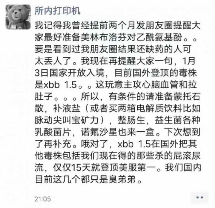 “1月3日国家开放入境,目前国外登顶的毒株是XBB.1.5,这玩意主攻心脑血管和拉肚子,所以,有条件的请准备蒙脱石散……”近日,这样一条朋友圈截图在各网络平台流传,引发全国多地药房、电商平台止泻药物“蒙脱石散”、抗菌药“诺氟沙星”等一夜之间被抢购一空。随后“蒙脱石散”“诺氟沙星”等词条登上微博热搜,引发广泛讨论。
