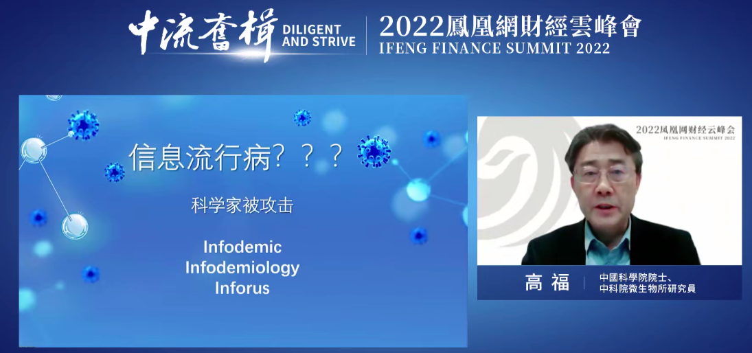 各地新一轮疫情暴发以来,网上出现大量信息,其中一些将正确的信息和不正确的信息混在一起,出现谣言四起的情况。在12月30日由凤凰网主办、凤凰网财经承办的“2022凤凰网财经峰会”上,中国科学院院士、中科院微生物所研究员高福提到了这一现象,指出“现在既要防新冠疫情,也要防‘信息流行病’。”