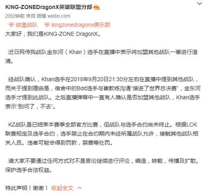 话说回来,Khan虽然提到EDG,但并没有正面表示会转会到该战队。所以在广大媒体人一波分析之后,KZ官方忽然在今天发表紧急辟谣:
