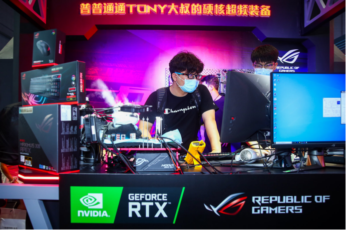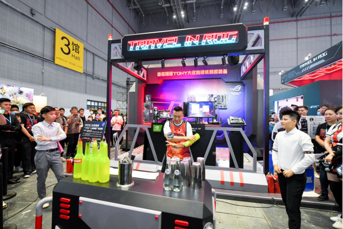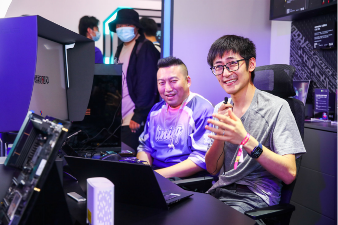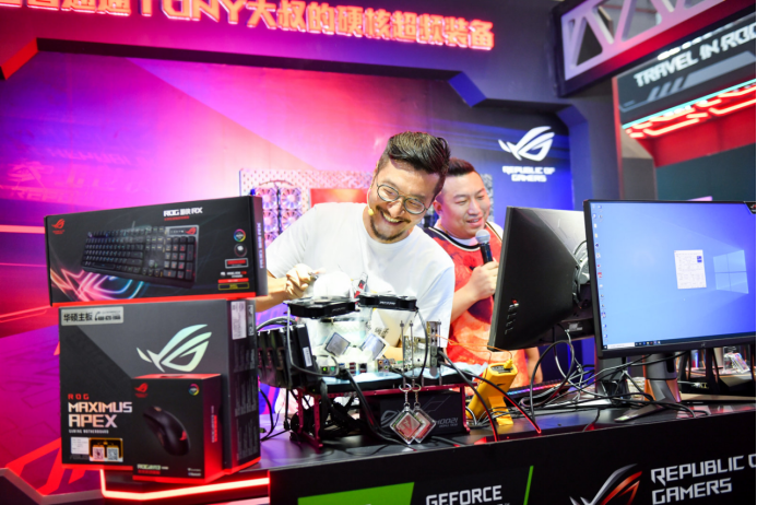 最值得关注的是,10日下午,Tony大叔和知名UP主@远古时代装机猿也来到活动现场。活动一开场,远古时代装机猿便秀起了压箱底的花式表演——花式调酒,6年未练,手法依然娴熟,令现场观众大开眼界。随后Tony大叔隆重登台,与远古时代装机猿一起尝试利用液氮挑战超频记录。随着液氮的注入,液氮大炮冒出阵阵白气吸引无数玩家驻足围观。