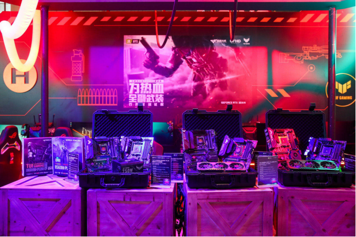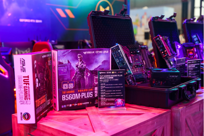 场地中心,ROG信仰星球以TUF GAMING B550M-PLUS重炮手CFHD定制版主板为首、还展示了TUF GAMING Z590-PLUS WIFI、TUF GAMING B560M-PLUS WIFI重炮手、TUF GAMING X570-PLUS(WI-FI)和TUF GAMING B450M-PRO S重炮手等一系列TUF GAMING电竞特工系列明星产品。
