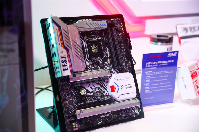 华硕Z590主板机动战士高达版也首次在线下亮相,其采用经典元祖高达蓝白配色,主板正面散热装甲以及PCB板都加入了阿姆罗座驾RX-78-2的纹饰,背面也有大面积高达图案,全方位深度定制的高达元素让你瞬燃战斗激情。