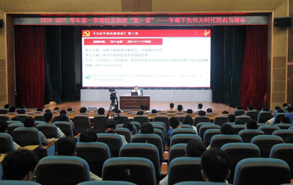——推动学习进课堂,上好“思政第一课”。9月,该校党委书记曹俊明、校长潘新祥通过线上线下方式,为超过5000人次的学生讲授了秋季学期“思政第一课”,通过介绍《习近平谈治国理政》第三卷的主要内容、框架体系、重要论断和丰富内涵,结合该校改革发展实际,引用大量鲜活抗疫案例,深入对比分析国内外疫情防控和社会经济发展形势,引导青年学子深入了解《习近平谈治国理政》第三卷出版的时代背景和重大意义,勉励学子用科学理论武装头脑,做中国特色社会主义制度的坚定信仰者和捍卫者,做不负伟大时代的有为青年。