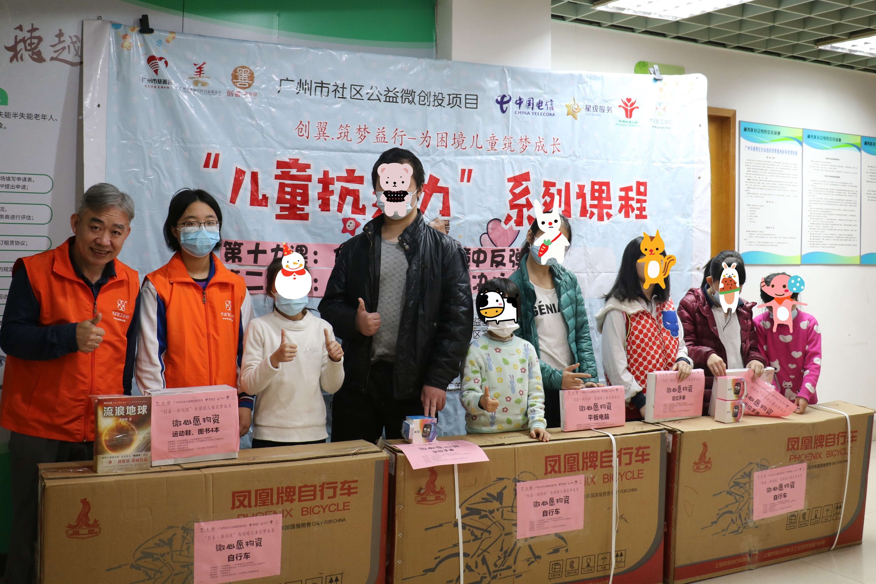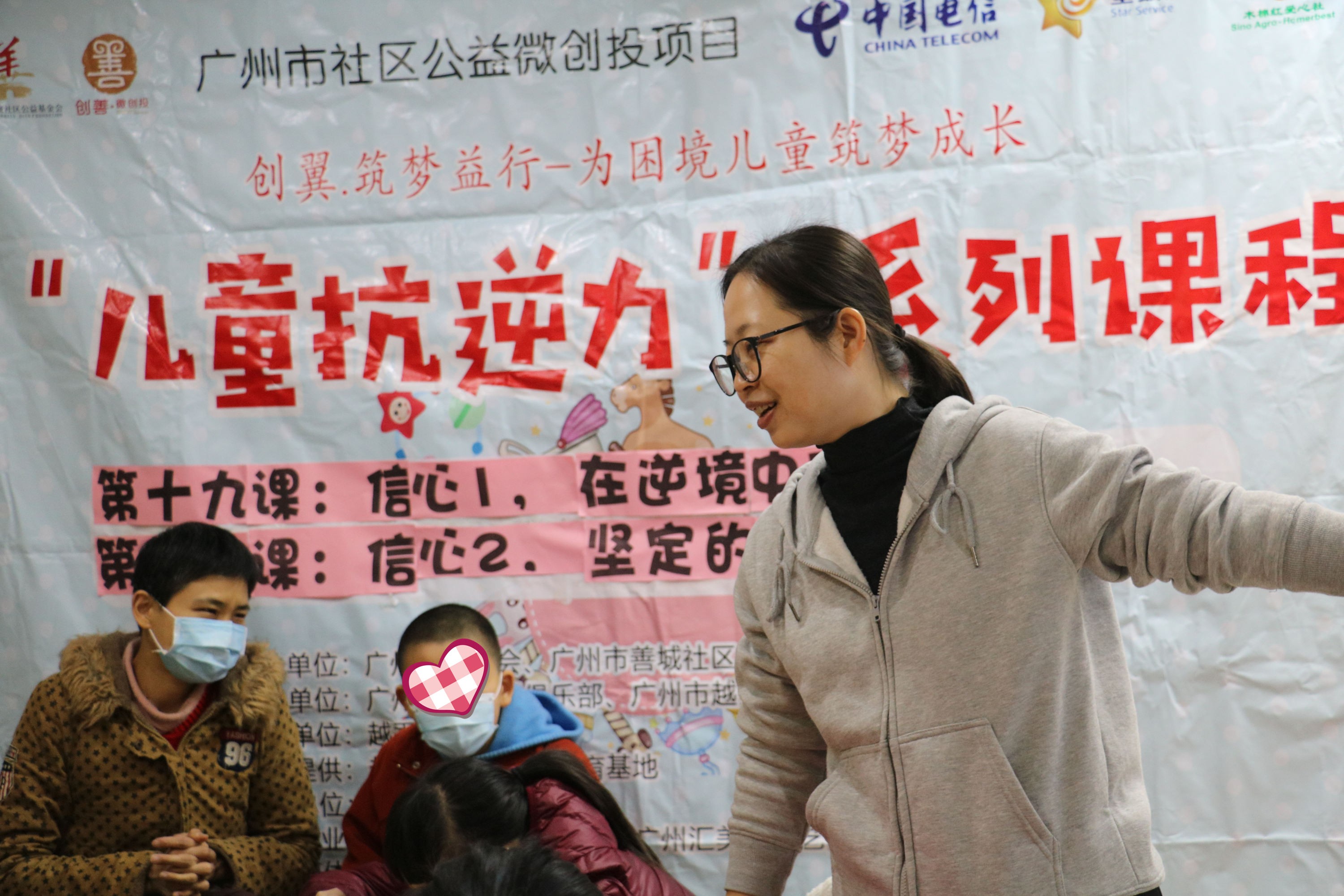 1月31日周日上午,由广州市慈善会、广州市善城社区公益基金会资助,越秀区民政局协办,广州电信天翼俱乐部与广州市越秀区齐志社会工作服务中心联合主办的“为困境儿童筑梦成长”儿童抗逆力第十九和第二十课在越秀区较场西路东关汛3号三楼顺利结束。本项目得到广东中农企业总公司、广州汇美思工艺品有限公司、木棉红爱心社的支持,本次课程由国家二级心理咨询师潘倩仪老师担任课程导师。本期课程有12名孩子和8名家长以及4名志愿者参加,其中一名服务对象和家长主动成为志愿者参与了本次课程。