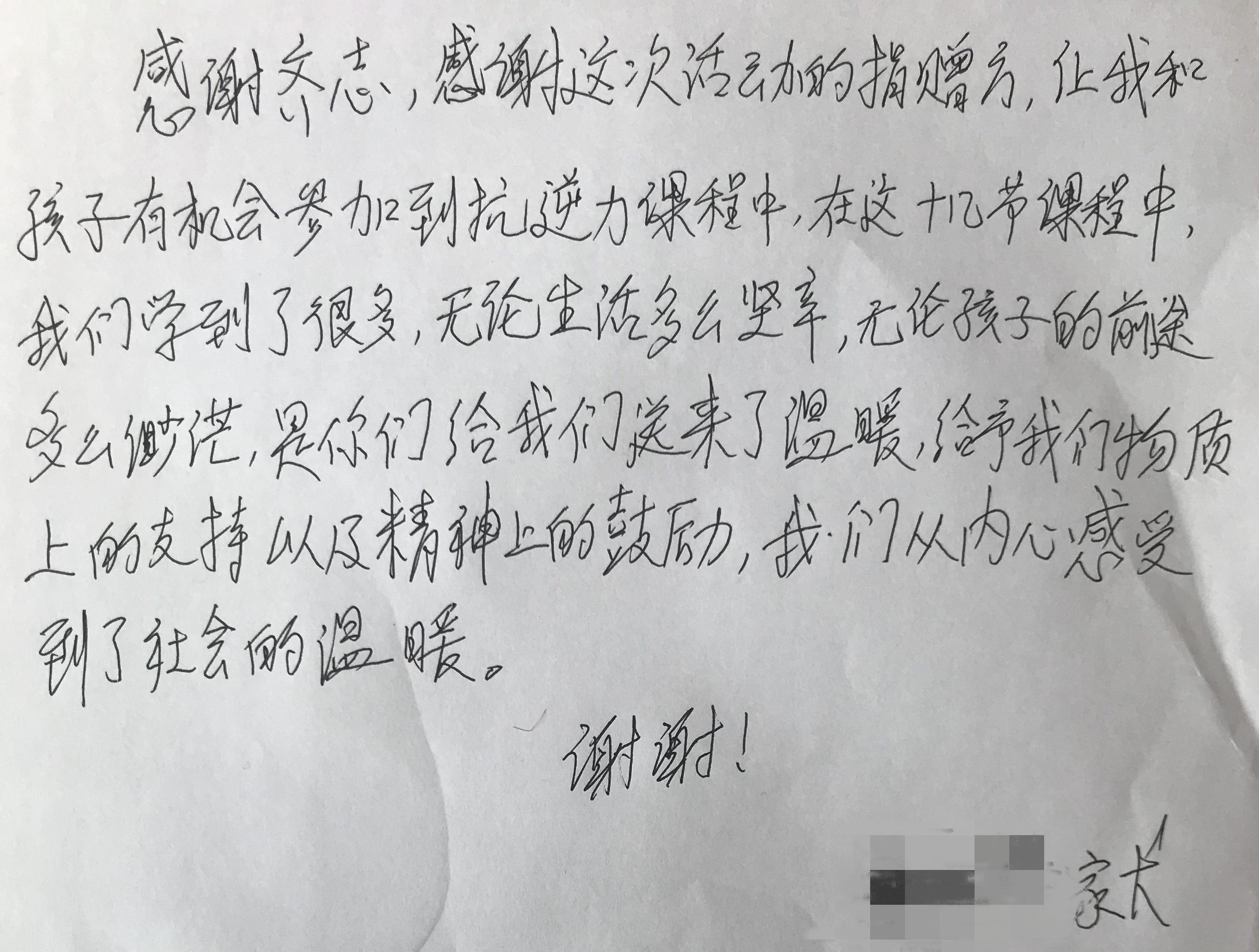 其中一名家在写给齐志的感谢信中写道:“感谢齐志,感谢这次活动的捐赠方,让我和孩子有机会参加到抗逆力课程中,在这十几节课程中,我们学到了很多,无论生活多么艰辛,无论孩子的前途多么缈茫,是你们给我们送来了温暖,给予我们物质上的友持以及精神上的鼓励,我们从内心感受到了社会的温暖。谢谢!”