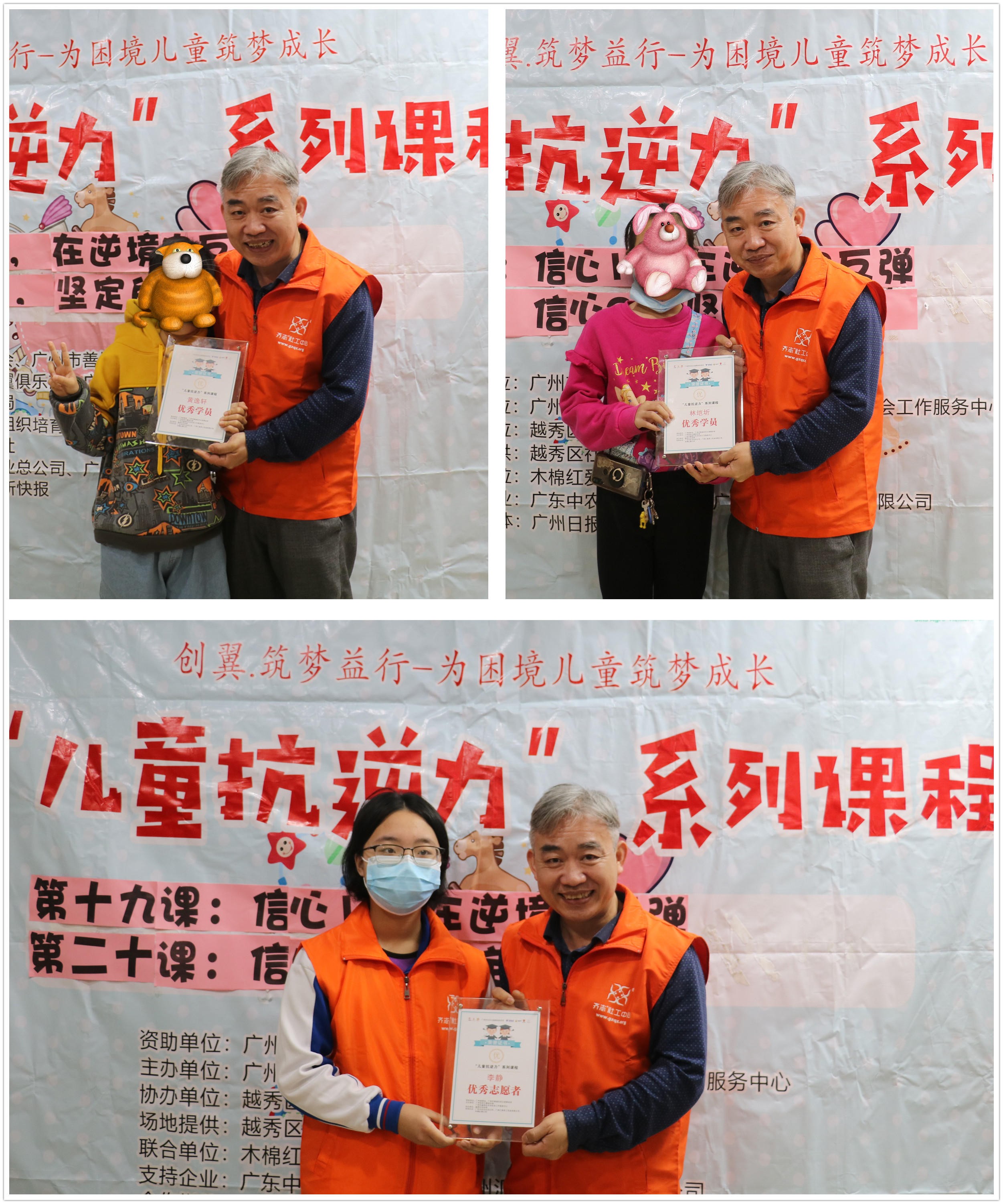 最后,齐志社会工作服务中心理事长李晓辉为本次课程的两名优秀学员和一名优秀志愿者进行了表彰。截至目前,齐志社会工作服务中心的二十节“儿童抗逆力”系列课程全部结束。李晓辉与孩子们和家长说道:由“创善·微创投”资助的“为困境儿童筑梦成长”项目虽然结束了,但我们为困境儿童的服务将会继续延续,未来将继续不断创新服务模式,链接资源和开发更多的优质课程,为困境儿童筑梦成长。