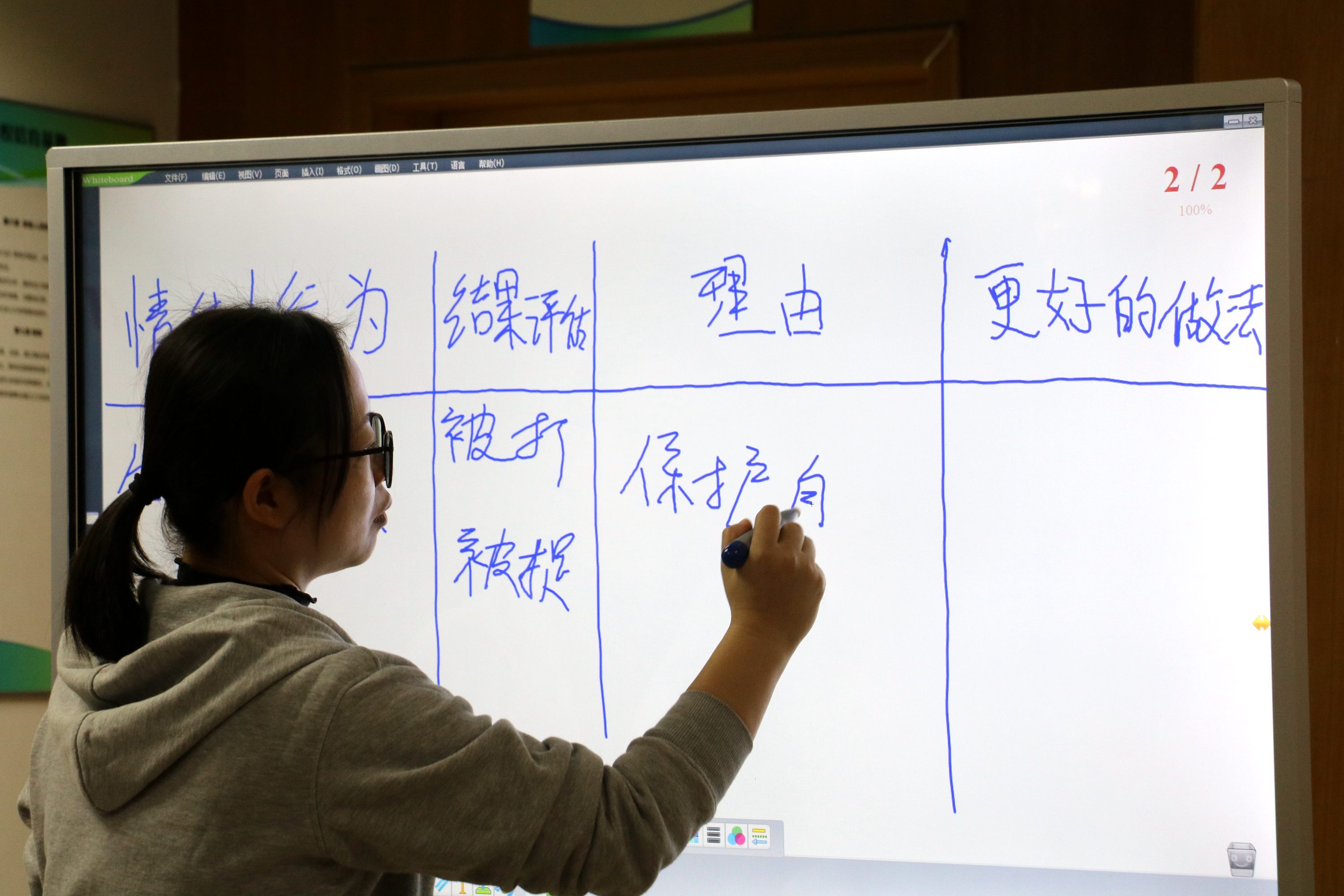 潘老师最后总结,说到“我们在生活中遇到挫折的时候就是会像这个游戏一样,很多时候都会得不到别人帮助。但我们在遇到困难的时候可以使用我们在课堂上学会的技能,来让自己保持积极,渡过这个困难时刻。”