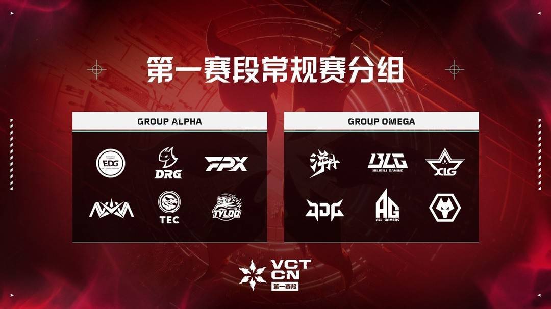 十二支2025年VCT CN联赛队伍根据启点赛排名被分为ALPHA、OMEGA两个组。其中EDG、DRG、FPX、NOVA、TEC、TYL六支队伍分入ALPHA组,TE、BLG、XLG、JDG、AG、WOL分入OMEGA组。
