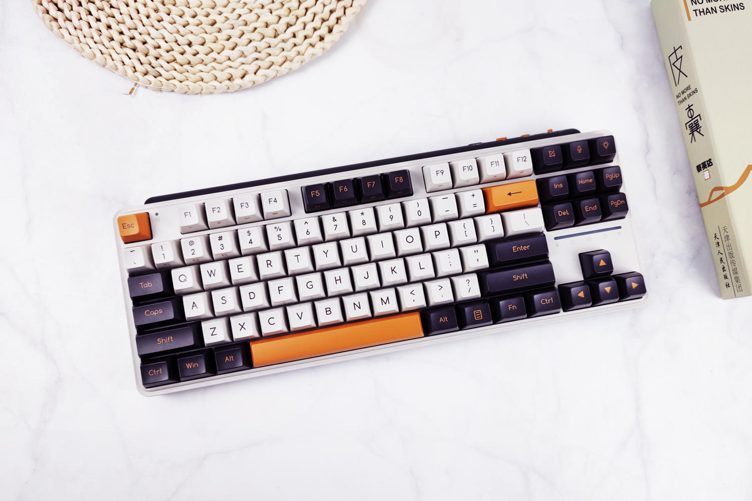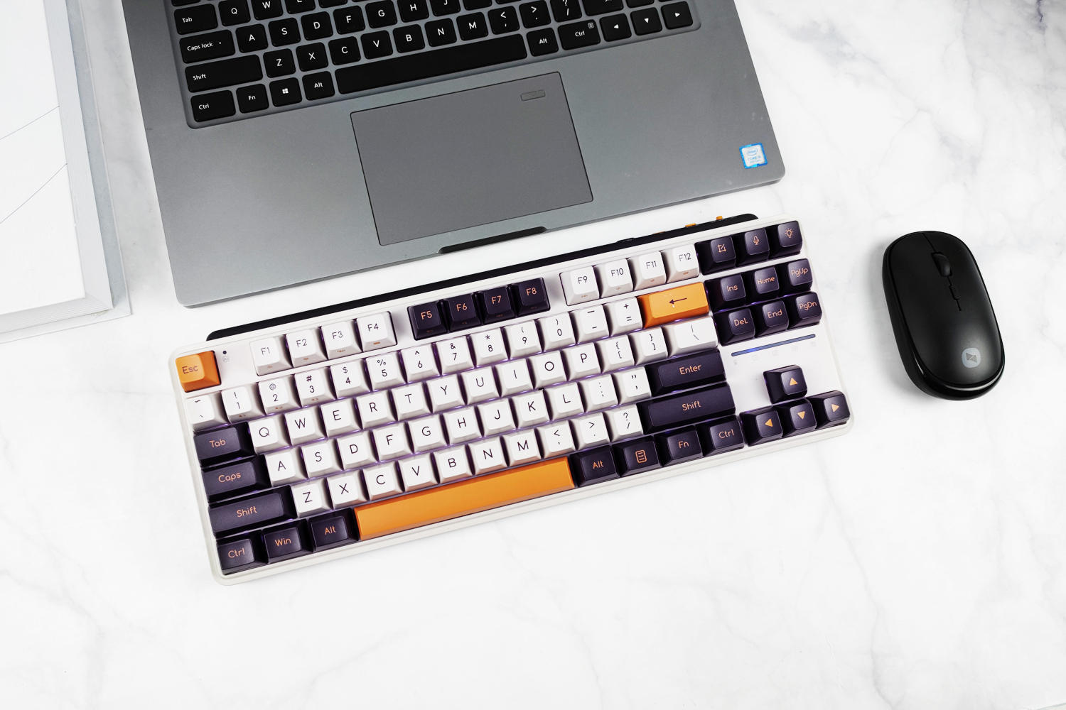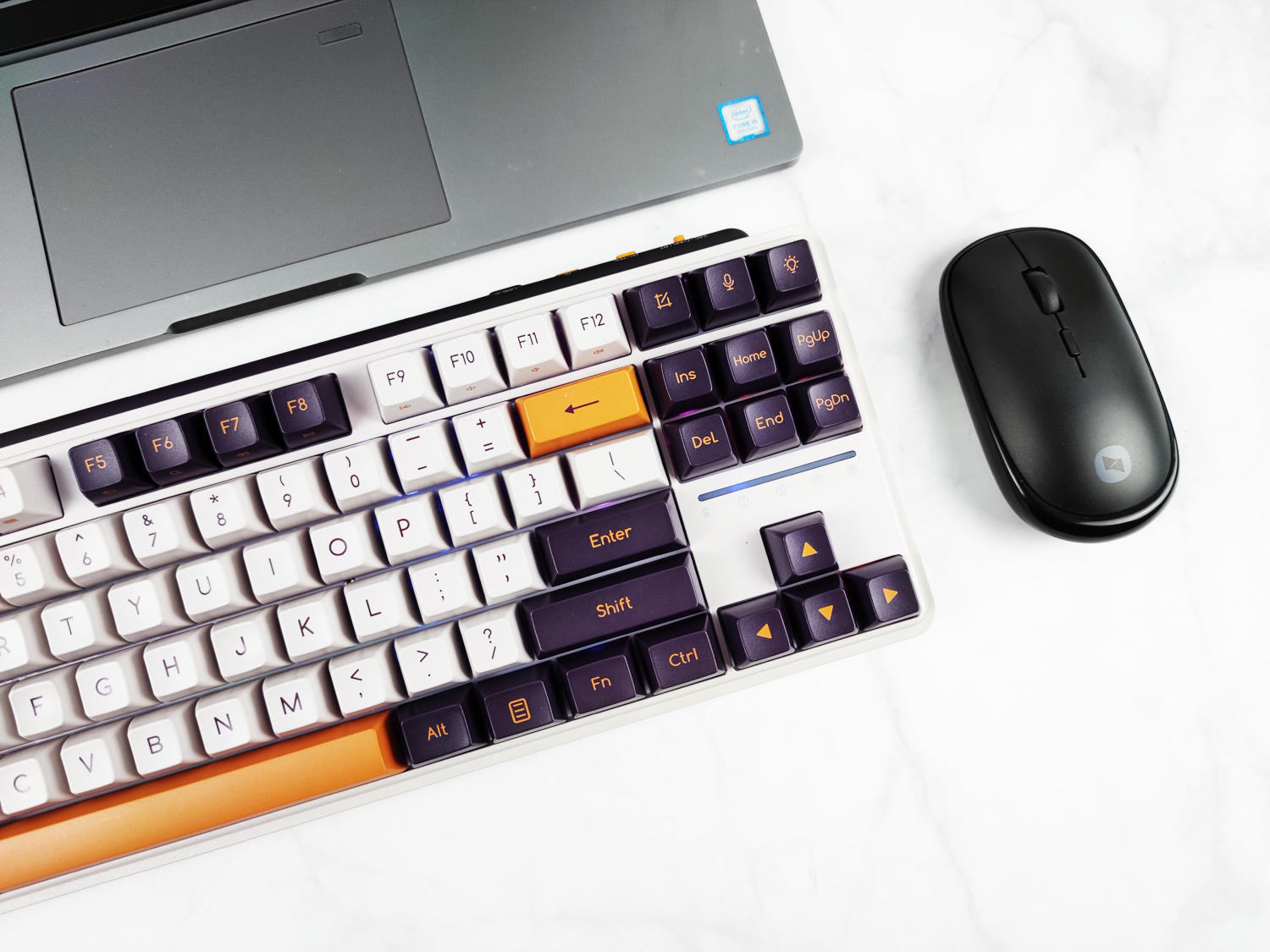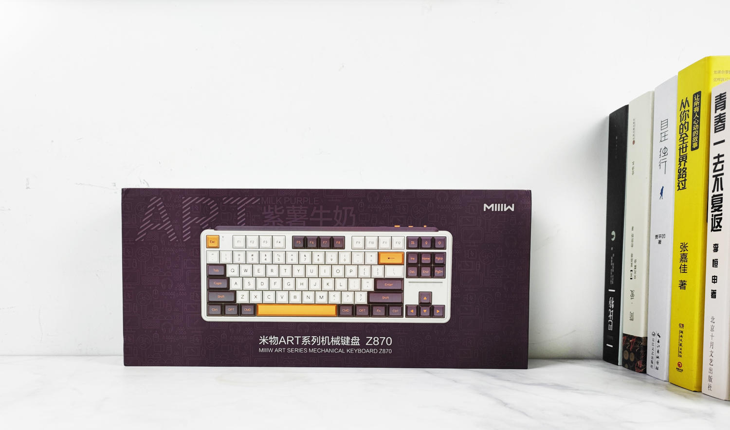 键盘有冬之旷野(佳达隆G黄PRO轴)、紫薯牛奶(凯华B0X红轴)两种可选,我这款是紫薯牛奶配色,主色调为白色+暗紫色+橙色,复古风造型、力量感十足,外观符合我的审美。