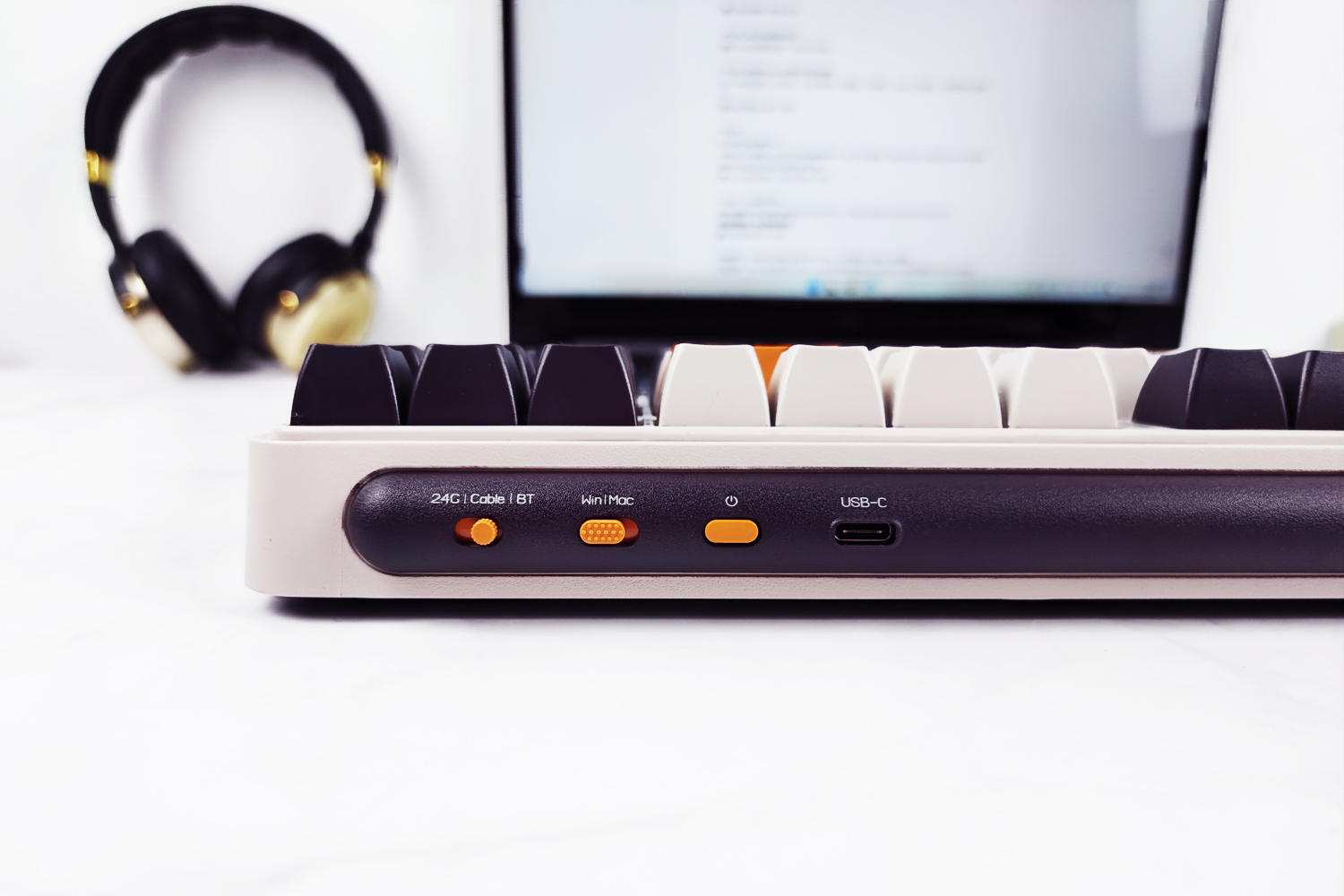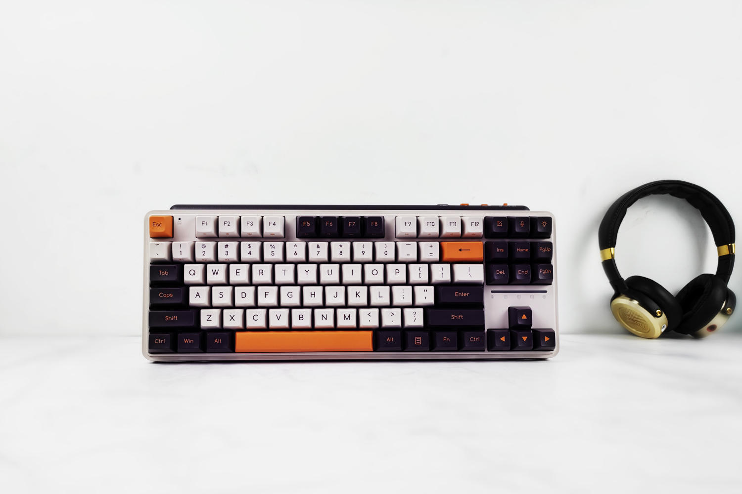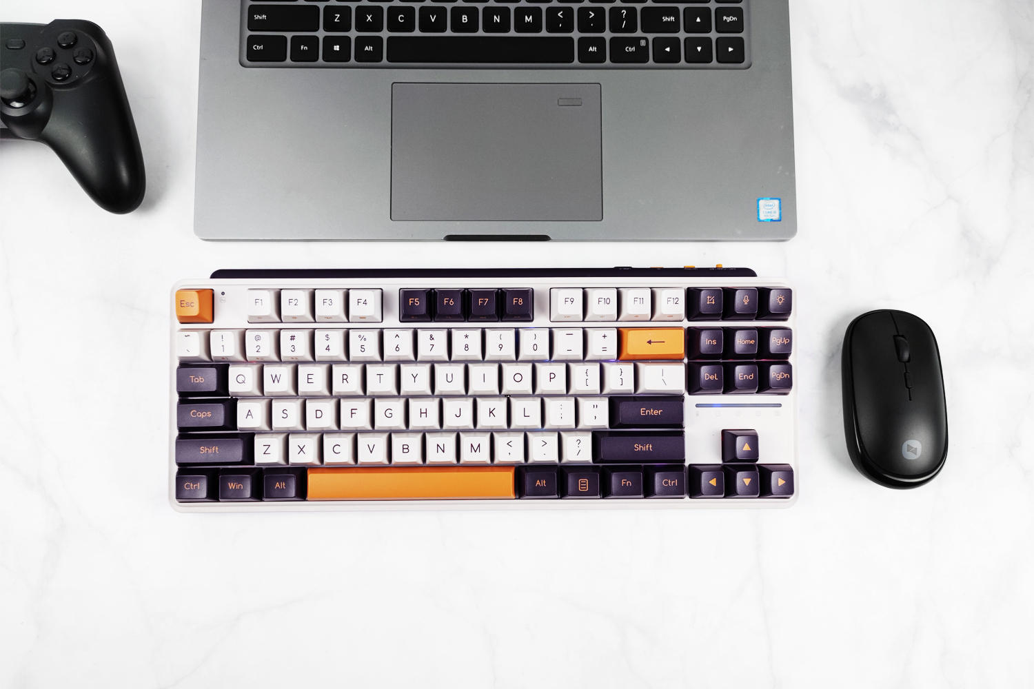 键盘有冬之旷野(佳达隆G黄PRO轴)、紫薯牛奶(凯华B0X红轴)两种可选,我这款是紫薯牛奶配色,主色调为白色+暗紫色+橙色,复古风造型、力量感十足,外观符合我的审美。